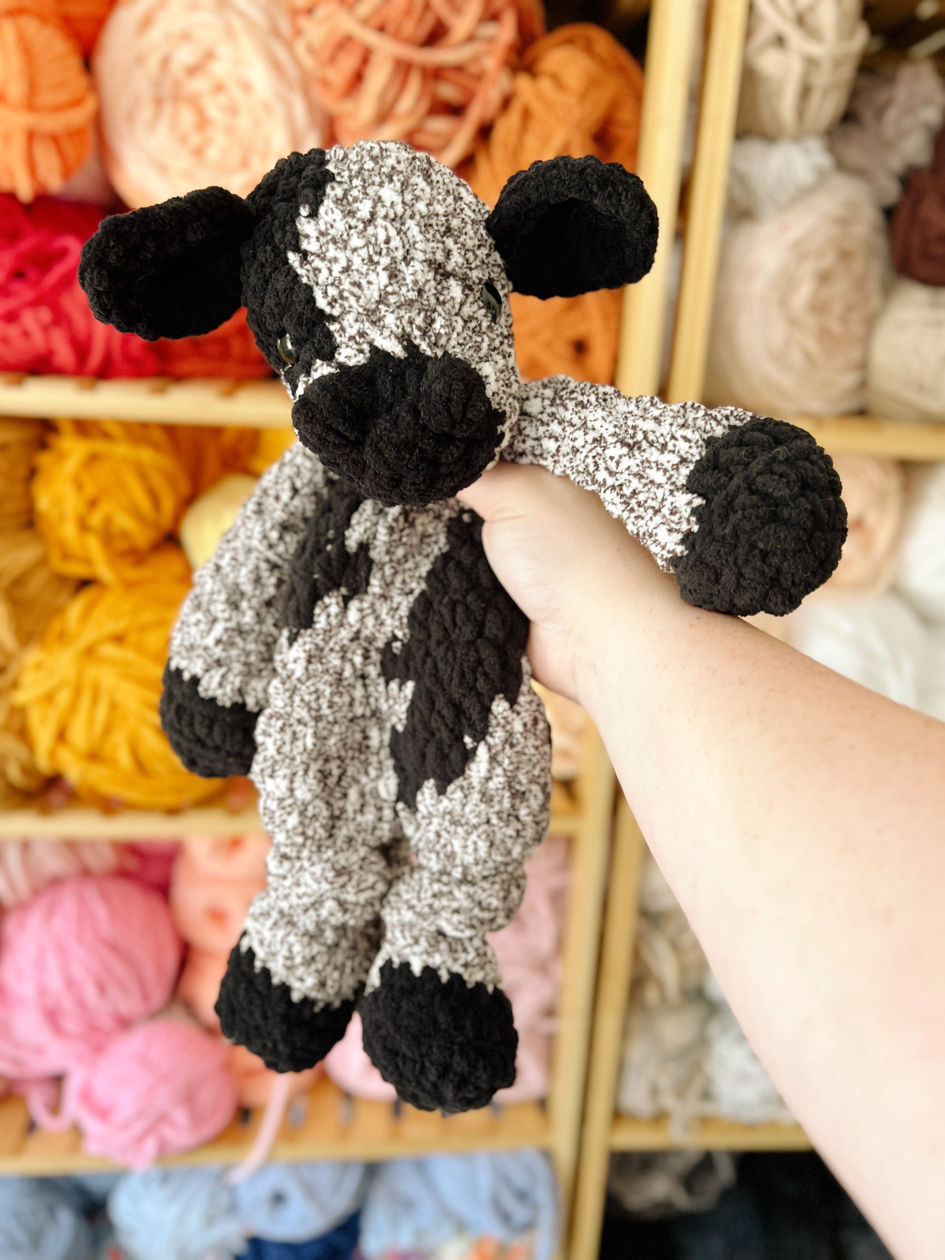 Darling, crocheted calf made of plush blanket yarn in black and speckled white. Finished with safety eyes.